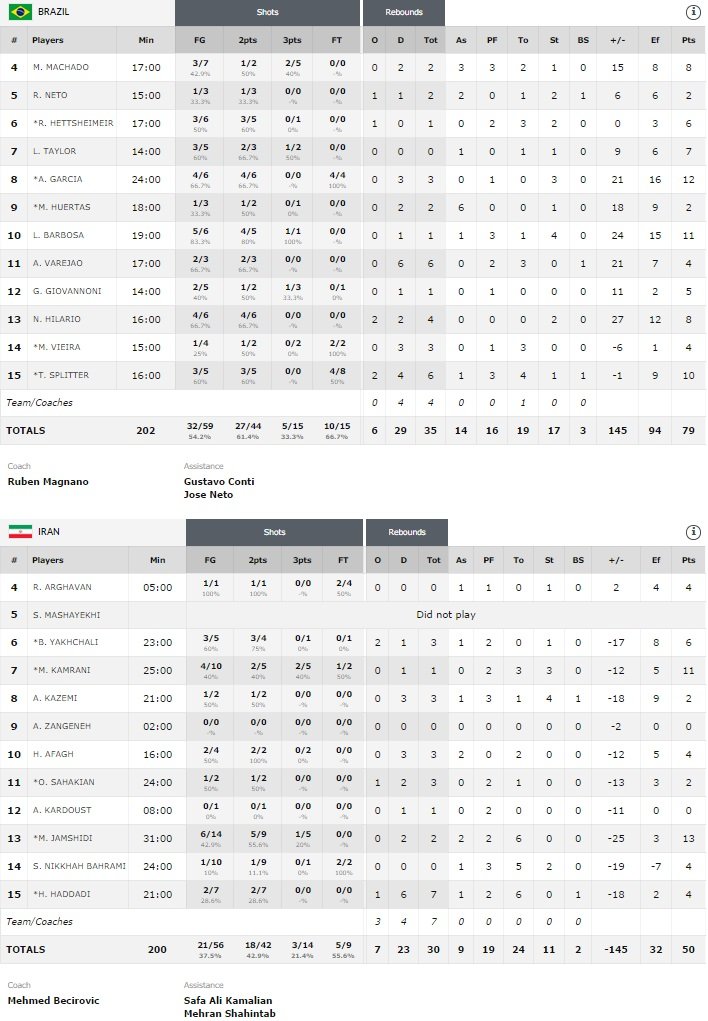 6 Brésiliens marquent entre 7 et 12 points dont 12 pour Alex Garcia, 11 pour Leandro Barbosa et 10 pour Tiago Splitter. ils ont shooté à 54..2% contre seulement 37.5 pour l’Iran. Hamed Haddadi a souffert face à la raquette brésilienne et il termine avec seulement 4 points, 7 rebonds et 6 ballons perdus.