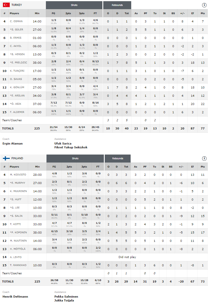 Les Finlandais peuvent s’en vouloir, ils avaient le match en main avant de mal gérer leur fin de rencontre et s’incliner finalement face à une équipe de Turquie qui effectue son deuxième comeback de la compétition pour arracher la victoire. La Turquie s’impose 77-73 après prolongation alors qu’ils ont connu une première mi-temps très mauvaise. Mais ils ont pu compter sur un grand Omer Asik (22 points et 8 rebonds)