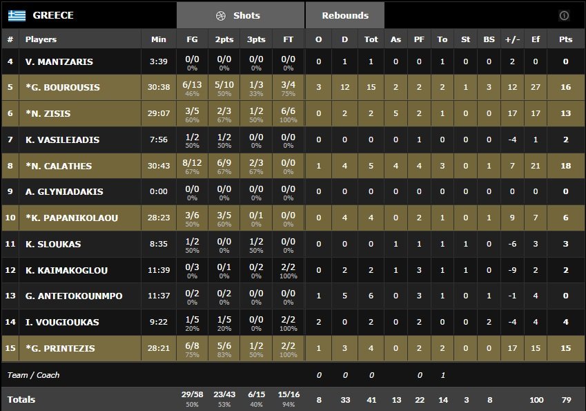 Le quatuor Nick Calathes (18 points, 5 rebonds et 4 passes), Nikos Zisis (13 points) Ioannis Bourousis (16 points et 15 rebonds) et Yorgos Printezis (15 points)a été excellent et a mené la Grèce avec 62 des 79 points de l’équipe. La Grèce a une nouvelle fois fait vivre une soirée difficile à l’attaque adverse l’Argentine étant limitée à 38% aux tirs.