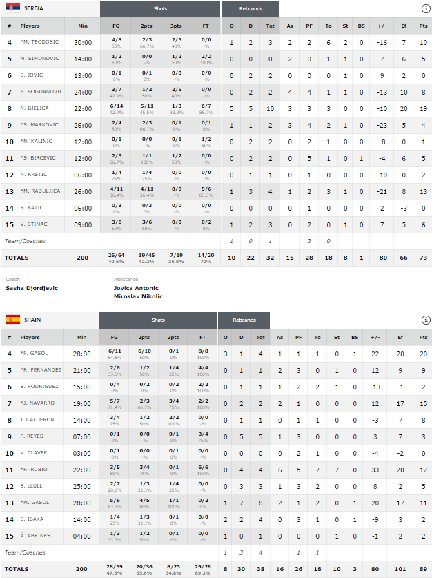 Même si ce match n’avait aucun enjeu, on a assisté à une rencontre très engagée avec quelques frictions et l’Espagne a mis un point d’honneur à le remporter encore avec la manière 89 à 73. Elle a fait la différence en premier quart et a ensuite géré le reste du match en dégageant toujours ce sentiment de puissance et de domination même si les Serbes ont affiché de l’opposition. Pau Gasol a encore une fois régné dans la raquette avec 20 points, bien aidé par son frère Marc auteur de 11 points à 5/6. Rubio a lui été excellent à la baguette avec 12 points, 4 rebonds, 6 passes, 7 interceptions mais 7 ballons perdus. Juan Carlos Navarro a lui signé 15 points à 5/7 en 19 minutes.