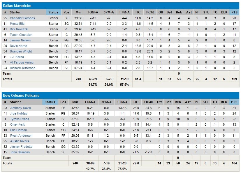 Les Pelicans, portés par les 22 points de Tyreke Evans et les 24 unités de Jrue Holiday, vont rattraper un déficit de 17 points avant de perdre la rencontre. Tyson Chandler a bien défendu sa raquette tout en apportant 11 points 7 rebonds et 2 contres. Devin Harris et Brandon Wright ajoutent 12 points pour des Pelicans plus adroits (51,7% contre 42,7%) et plus à l’aise au scoring dans la raquette (62 points à 46). Dallas prend facilement 10 points d’avance 20 à 10 après 7 minutes de jeu et l’écart passe à 17 points dans le deuxième quart-temps mais Evans rentre un 3-points qui permet à son équipe de n’être menée que «que» de 14 points à la pause.