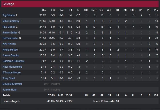 Les Bulls prennent finalement le contrôle dans le troisième quart-temps au terme d’un 17-3. Un 3-points pour Derrick Rose, un gros dunk de Gibson puis 4 points consécutifs de Gasol ont raison des minces espoirs de l’équipe de Lionel Hollins, 70-58 et 3″32 à jouer dans le troisième quart. La situation empire un peu plus après 15 points consécutifs de Chicago pour clore le match en beauté dans le dernier quart, 101-73 à 3″17 du buzzer final.
