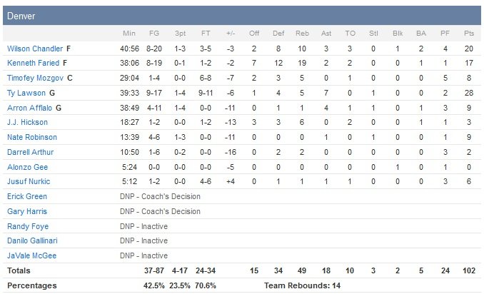 Lou Williams le 6e homme de luxe apporte également beaucoup au scoring avec 30 points à 11/18 et 5 rebonds et les Raptors remportent leur 7e match en 8 rencontres. Après une performance énorme vendredi (26 points et 25 rebonds contre Minnesota), Kenneth Faried termine lui à 17 points et 19 rebonds pour les Nuggets, qui perdent leur 3e match en 4 rencontres. Son coéquipier Wilson Chandler ajoute 20 points (8/20) et 10 rebonds. Toronto prend l’avantage en fin de premier quart-temps puis prend 13 points d’avance à 2″50 de la fin du deuxième. Denver recolle à 56-54 sur une claquette dunk de Faried à 37.4 secondes de la mi-temps mais les Raptors inscrivent les 4 derniers points de la période et mènent 60-54 à la pause. Toujours dans le sillage de Faried, les Nuggets parviennent à prendre l’avantage 76-75 en milieu de troisième quart-temps. Toronto reprend rapidement 4 points d’avance mais une interception et un shoot de Nate Robinson rapproche Denver à un point, 88-87.