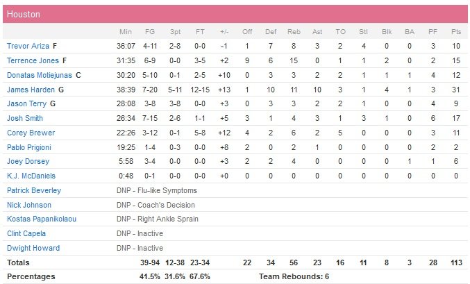 Houston prend le meilleur départ au retour du vestiaire mais un 3-points d’Adreian Payne (11 points à 4/15 et 10 rebonds), titularisé pour la première fois de sa carrière vient démarrer un 7-1 en faveur de Minnesota pour revenir à 76-72. Encore une fois Houston réagit bien avec un 8-3 qui leur permet de reprendre la tête tranquillement, 84-75. Les joueurs de Kevin McHale comptent 9 points d’avance en début de quatrième quart-temps et marque les 6 premiers points de la période (92-78) mais Andrew Wiggins réduit l’écart à un point à moins de 4 minutes. L’ailier score 7 points durant un 10-0 qui ramène Minnesota à deux points, 92-88. Jason Terry répond par un 3-points mais Wiggins n’en a pas terminé et démarre un 7-0 qui porte le score à 97-96 alors qu’il reste trois minutes et demi à jouer. À partir de là, les Rockets, jamais en panique, passent un 14-2 aux visiteurs du jour (5 points d’Harden), 111-98 alors qu’il ne reste que moins d’une minute au compteur.