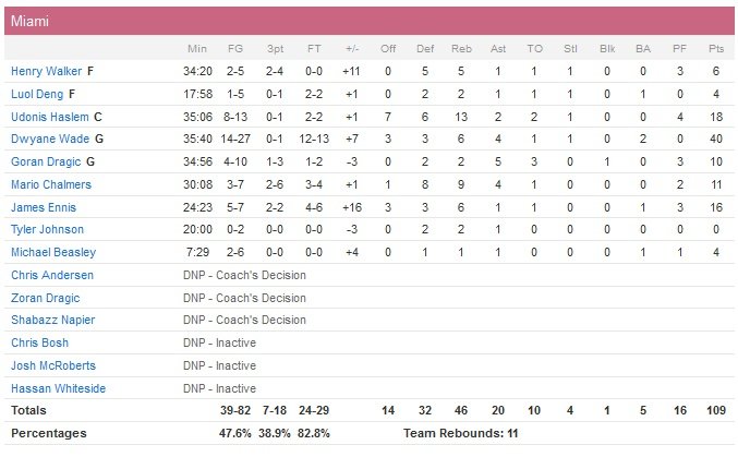 Soulagé par un drainage sur son genou gauche la veille, Dwyane Wade a explosé les compteurs cette nuit dans la victoire du Heat, 109-102, face à Detroit. Le n°3 plante 19 de ses 40 points (14/27, 6 rebonds, 4 passes) dans le quatrième quart-temps pendant que son vieux compère Udonis Haslem ajoute 18 points et 13 rebonds. Et avec en plus 16 points de James Ennis, Miami, 7e, remporte un 5e match consécutif à la maison.