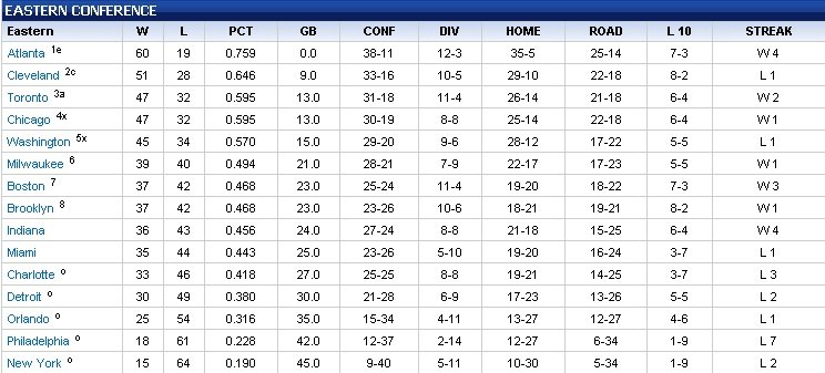 On connait déjà le classement définitif de deux équipes: les Hawks et les Cavaliers. Cette nuit les Hornets ont été éliminés et il y a donc deux luttes distinctes