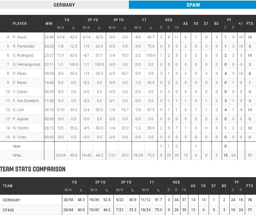 L’Allemagne n’a pas pu faire de run et réduire l’écart dans les premières minutes, l’Espagne conservant plus de 10 points d’avance. Ce début de run est arrivé à 5 minutes de la fin sous l’impulsion de Dennis Schröder avec un retour à 4 points sur deux tirs derrière l’arc du meneur des Hawks et de Maodo Lo, 70-66 à 3 minutes du buzzer. Les locaux ont eu deux ballons de suite pour revenir à deux points mais Sergio Rodriguez a climatisé la salle sur une banderille à trois points alors que les Allemands perdaient deux ballons de suite, 73-66 à 1 minute du buzzer. Pas suffisant pour enterrer l’Allemagne qui en 20 secondes est revenu à 1 points sur deux shoots derrière l’arc de Nowitzki et Lo, 73-72 à 20 secondes de la fin. Au jeu des lancers les deux équipes n’ont pas craqué jusqu’à ce que Schröder obtienne 3 lancers pour égaliser. Après avoir mis les deux premiers, il a raté le dernier, scellant le score du match.