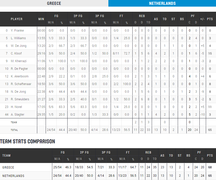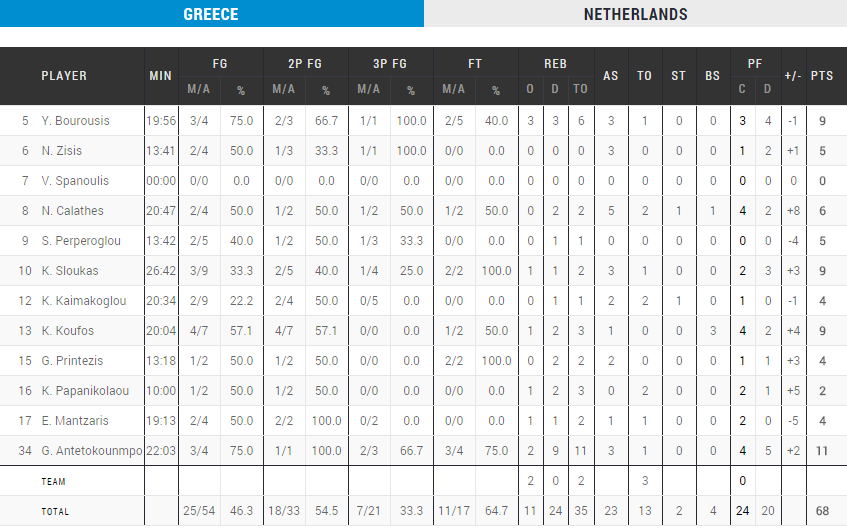 Comme la France et la Serbie, la Grèce a remporté ses 5 matchs du premiers tour avec un dernier succès 68-65 face aux Pays-Bas. ils ont toutefois dû s’employer face à une équipe des Pays-Bas qui pouvait se qualifier en cas de victoire. La Grèce retrouvera en 8ème la Belgique.