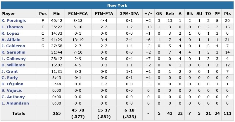 Arron Afflalo sort un très propre 31 points à 13/19, 7 rebonds et 4 passes tandis que Kristaps Porzingis répond aussi présent avec 20 points à 8/13, 13 rebonds, 2 contres. Langston Galloway et Jose Calderon manquent eux chacun un 3-points qui aurait égaliser dans la dernière minute. Les Knicks prennent jusqu’à 15 points d’avance en 1ère mi-temps et étaient encore en tête 91-77 sur un 3-points de Derrick Williams (12 points à 4/5 en 15 minutes) à 8’04 de la fin du 4e. Houston, qui passe un 12-0 à ses adversaires pour revenir à 91-89 à 5’29, va finalement égaliser sur un 3-points de Thornton à 32 secondes de la fin de la dernière période.
