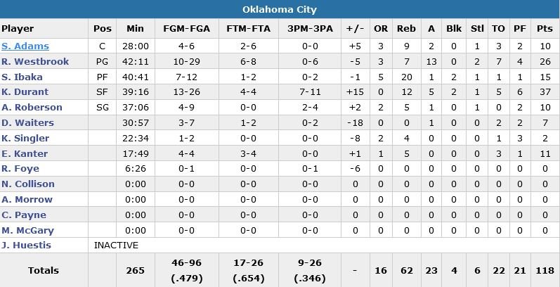 Et dire qu’il s’était tordu la cheville gauche en début de seconde mi-temps et qu’il n’a donc joué « que » 37 minutes… Ah, et il a aussi battu son propre record de 3-points réussis en une seule saison avec désormais 288. Le Thunder, porté par un trio Kevin Durant (37 points à 12/26, 12 rebonds et 5 passes, sorti pour 6 fautes après une minute en prolongation) – Russell Westbrook (26 points à 10/29, 7 rebonds et 13 passes) – Serge Ibaka (15 points à 7/12 et 20 rebonds) bien aidé par Andre Roberson (10 points à 4/9 et 5 rebonds) sur quelques séquences clutchs, a compté jusqu’à 12 points d’avance dans le 4e quart-temps avant de subir les coups de folie répétés du n°30 de Golden State.