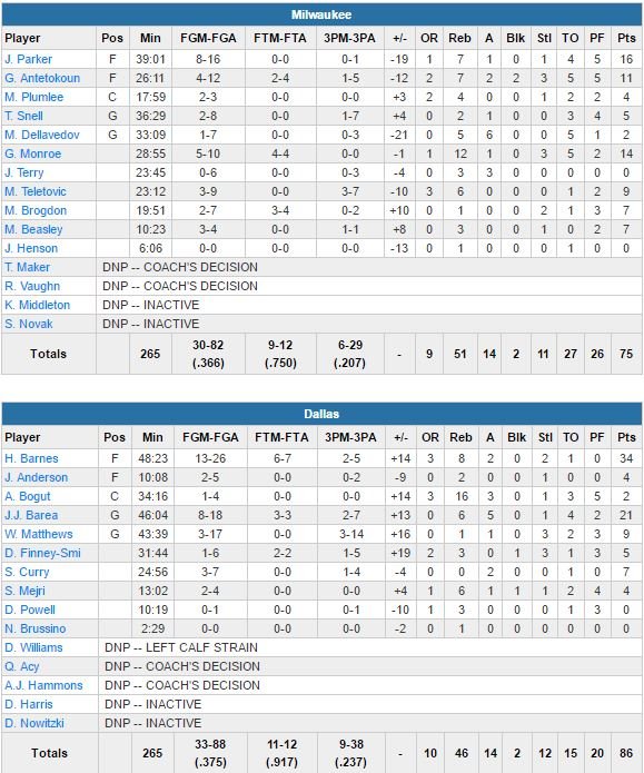 En l’absence de Dirk Nowitzki (tendon d’Achille) et Deron Williams, J.J. Barea inscrit 21 points dont 5 en prolongation. Wesley Mattews s’est lui rattrapé d’une soirée laborieuse (3/17) en rentrant un 3-points à 59 secondes en prolongation pour donner 9 points d’avance à Dallas. Jabari Parker termine modeste meilleur marqueur de Milwaukee avec 16 points, et seulement 2 après la mi-temps. Greg Monroe est lui en double-double (14 points et 12 rebonds) pour les Bucks, qui restaient sur 2 victoires en 3 matchs.