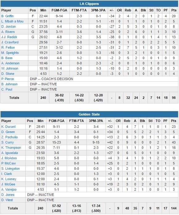 Les Clippers, portés par un Blake Griffin pas encore à son meilleur niveau (20 points à 9/14, 4 rebonds et 2 passes) subissent une 4ème défaite en 5 matchs depuis la blessure de Chris Paul. Golden State remporte au passage une 8ème victoire consécutive contre Los Angeles, avec 23 points à 9/11, 4 rebonds et 7 passes de Kevin Durant et 16 points à 7/11 de Klay Thompson. C’est en fin de 1ère mi-temps (conclue par un shoot du milieu du terrain au buzzer de Curry) que les hommes de Steve Kerr vont réellement démarrer la boucherie avec un 17-6 sur les dernières 2’14. Durant trouve un bank shot, Draymond Green (5 points à 1/4, 5 rebonds, 2 contres et 2 interceptions en 25 minutes) bâche Griffin et enchaîne sur un dunk puis après un nouveau stop, Thompson met dedans à 3-points, 62-45. Le buzzer de Curry donne 21 points d’avance aux siens, 72-51.
