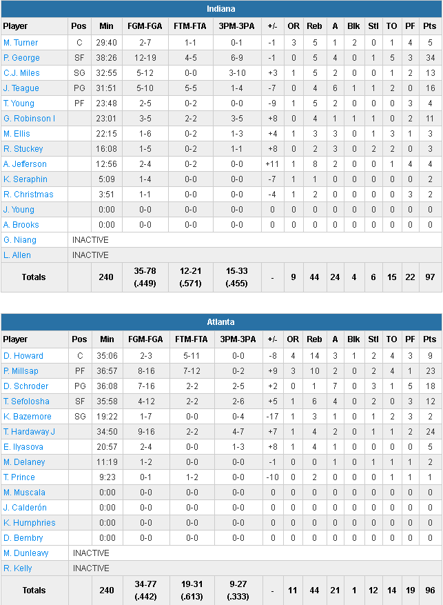 Paul George a été le grand artisan du succès des siens avec 34 points à 12/19 dont 6/9 à 3-pts, même s’il a été moins en vue en seconde mi-temps. Jeff Teague ajoute 16 points et CJ Miles 13. Glen Robinson III marque lui 11 points en sortie de banc à 3/5 à 3-pts. Les Pacers shootent à un excellent 15/33 derrière l’arc contre seulement 9/33 aux locaux. Ces derniers tenaient ce match avec 4 points d’avance dans la dernière minutes. Paul Millsap a été le meilleur Hawk avec 23 points à 8/16 et 10 rebonds alors que Tim Hardaway Jr. ajoute 24 points à 9/16 dont 4/7 à 3-pts et Dennis Schröder 18 points et 7 passes.
