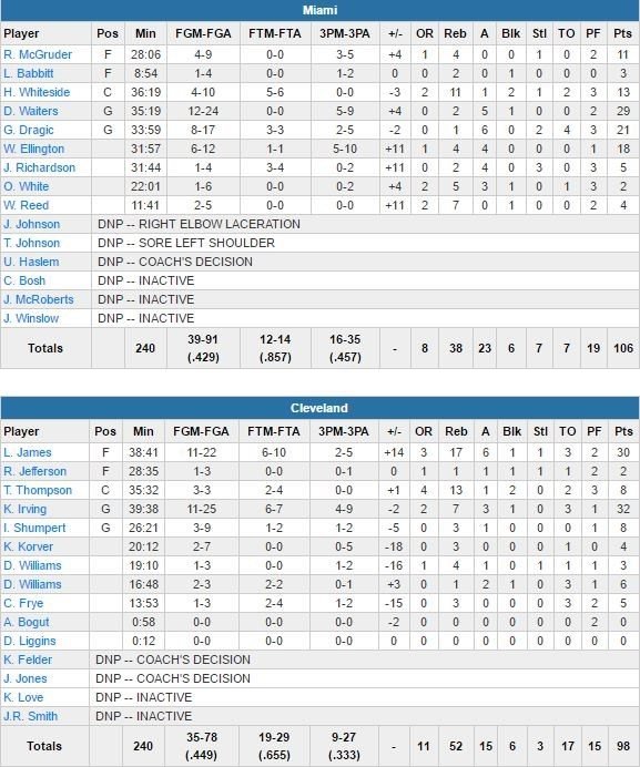 À noter : Cleveland a joué sans Tyronn Lue, malade. Miami signe un 16/35 à 3-points, contre 9/27 pour Cleveland. Le Heat est en revanche dominé 52 rebonds à 35.