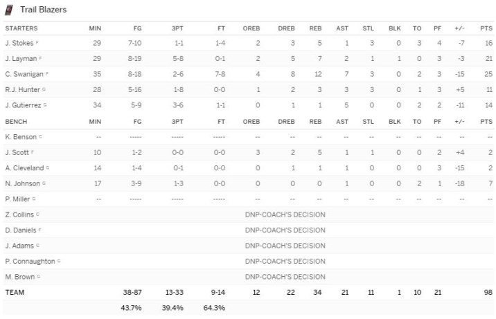 Devant d’un point seulement à la mi-temps (59-58) suite à des problèmes de ballons perdus, les Lakers (61.5% de réussite, 14/24 à 3-points) ont fait la différence au retour des vestiaires avec un 26-20 et un 26-19 infligé à leurs adversaires dans le 3ème et le 4ème quart-temps.