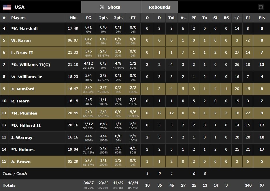 Pour son entrée dans la compétition, l’équipe D de Team USA, n’a pas connu de mésaventure en écrasant logiquement le Panama, loin d’être un gros calibre de la compétition. Les hommes de Jeff Van Gundy s’imposent sur le score de 97-56 au terme d’une très bonne prestation collective. Sur 34 paniers ils ont distribué pas moins de 29 passes décisives pour 13 ballons perdus.