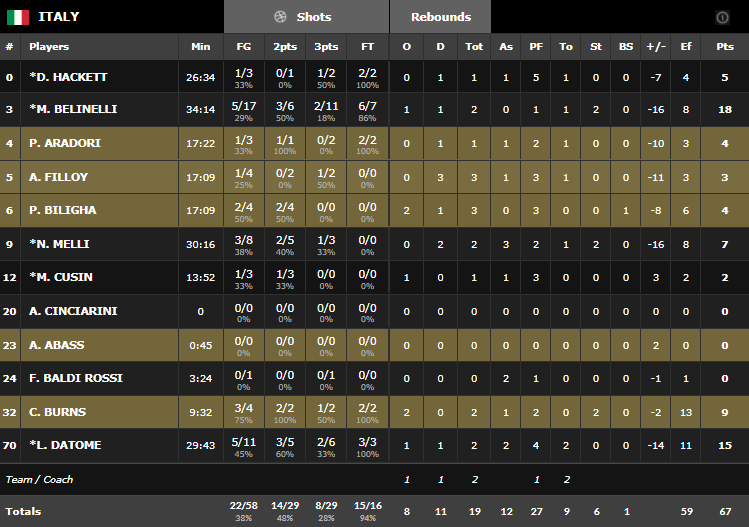 Dominée au rebond et à l’intérieur, l’Italie a fini par prendre un run, assez sévère. Sous l’impulsion des 3-pts de Lucic et Macvan et des nombreux points dans la raquette, les Serbes ont passé un 12-2 pour mener 35-27. Les 3-pts coup sur coup de Burns et Datome ont fait du bien à l’Italie mais ce fut de courte durée, les Serbes pilonnant à l’intérieur pour finalement mener logiquement 44-33 à la pause. Après 20 minutes les Serbes dominaient 22-7 au rebond et affichaient un 16/16 aux lancers contre 2/3 aux Italiens. Ces derniers étaient encore dans le matchs grâce à leur 7/17 à 3-pts.