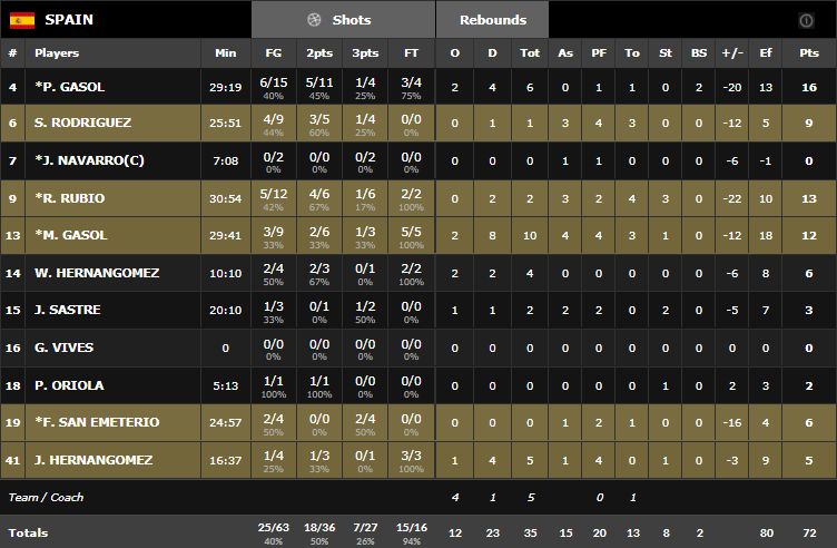 Le 5 Goran Dragic (15 points, 6 rebonds et 5 passes), Luka Doncic (11 points à 3/10 mais 12 rebonds et 8 passes), Anthony Randolph (15 points à 6/9) Klemen Prepelic (13 points à 5/8) et Gasper Vidmar (12 points et 5 rebonds) a été énorme, bien épaulé par des joueurs inattendus comme Dimec et Zagorac. Ils shootent à 14/25 à trois points contre un très mauvais 7/27 espagnol. Ces derniers n’ont sans doute pas assez servis leurs intérieurs, bien défendus par les Slovènes. Pau Gasol signe 16 points à 6/15 et Marc Gasol ajoute 12 points à 3/9. Meilleure défense du tournoi, l’Espagne n’a jamais réussi à ralentir les Slovènes et la zone, essayée deux fois, a été à chaque fois sanctionnée.