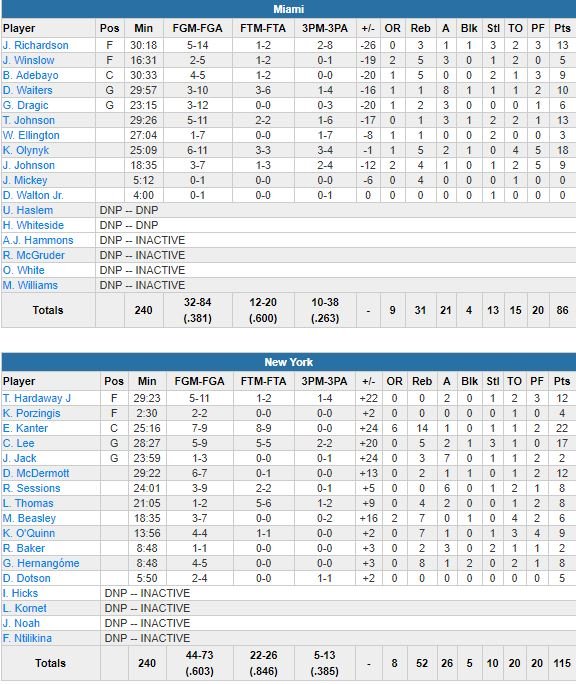 Kanter termine meilleur marqueur de New York avec 22 points à 7/9 mais aussi 14 rebonds, devant Courtney Lee et ses 17 points à 5/9. Miami, mené par les 18 points de Kelly Olynyk, termine son road trip avec 2 victoires et 2 défaites. Goran Dragic (6 points à 3/12) a souligné le manque d’énergie en défense de son équipe après le match. Et en effet, New York a shooté à 64% (60.3% sur le match contre un tout petit 38.1% pour Miami) pour mener 33-22 après un quart-temps, avant d’étendre son avance à 65-44 à la pause, puis 84-54 dans le 3ème quart-temps.