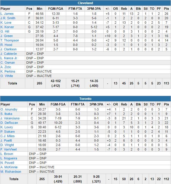Devant de jusqu’à 14 points, les Raptors ont laissé filer plusieurs occasions dans le money time, dont un 3-points pour la victoire raté par Fred VanVleet (9 points à 2/7, 3 rebonds, 2 passes) à 3.4 secondes du buzzer final. Jonas Valanciunas, Kyle Lowry et DeMar DeRozan (11 points dans le 1er quart) ont fait leur match avec respectivement 21 points et 21 rebonds, 18 points et 10 passes et 22 points. Cleveland a pris jusqu’à 6 points d’avance après le 3-points de Korver en prolongation mais après plusieurs possessions non fructueuses, Kyle Lowry a ramené les siens à 113-112 sur un and one à 57 secondes de la fin. VanVleet a ensuite eu l’occasion d’offrir la victoire aux siens après une violation des 24 secondes de la part des Cavs au terme d’une possession déprimante. En tout, Toronto aura manqué 4 fois sa chance sur des paniers potentiellement pour la victoire. L’équipe a terminé à 5/24 dans le 4ème quart-temps, avec un Valanciunas à 1/7.
