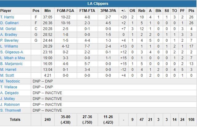 Les Clippers ont refusé de perdre cette nuit. Menés 77-71 alors qu’ils avaient pris jusqu’à 17 points d’avance, Danilo Gallinari (26 points à 10/16 et 5 rebonds), Tobias Harris (26 points à 10/22, 10 rebonds et 4 passes), Lou Williams (17 points à 4/12) et Boban Marjanovic (10 points dans le dernier quart, 13 points à 4/6 et 5 rebonds en 16 minutes) ont passé un 37-15 à leurs adversaires dans le dernier quart pour s’imposer 108-92.