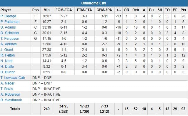 À noter : le Thunder a eu l’avantage 24 à 8 aux points inscrits sur seconde chance. Steven Adams a terminé à 17 points à 8/11 et 18 rebonds. Dennis Schröder 8 points à 2/15 et 8 passes.