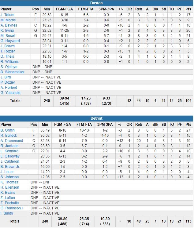 À noter : Detroit a shooté à 48.8%, Boston 41.5%. Marcus Smart a pris 3 fautes sur les premières 7’37 du match. Les Celtics étaient sans Jabari Bird (personnel), Al Horford (genou) et Guerschon Yabusele (cheville). Detroit était sans Henry Ellenson (cheville), Zaza Pachulia (malade), Glenn Robinson III (cheville) et Ish Smith (adducteur). Reggie Bullock était de retour après 5 matchs manqués pour soigner une cheville, il a terminé à 15 points. Aucune des équipes battues par les Celtics durant leur série de victoires ne possède actuellement un bilan positif. Gordon Hayward a signé 6 points à 3/11 en sortie de banc.