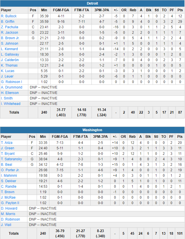 Les Wizards de Washington ont largement dominé les Detroit Pistons sur le score de 101-87. Avec ce succès, le 4ème lors des 5 derniers matchs, les Wizards reviennent à la hauteur de Detroit avec 20 victoires et 26 défaites et n’ont plus que 2 matchs de retard sur Charlotte, 8ème.