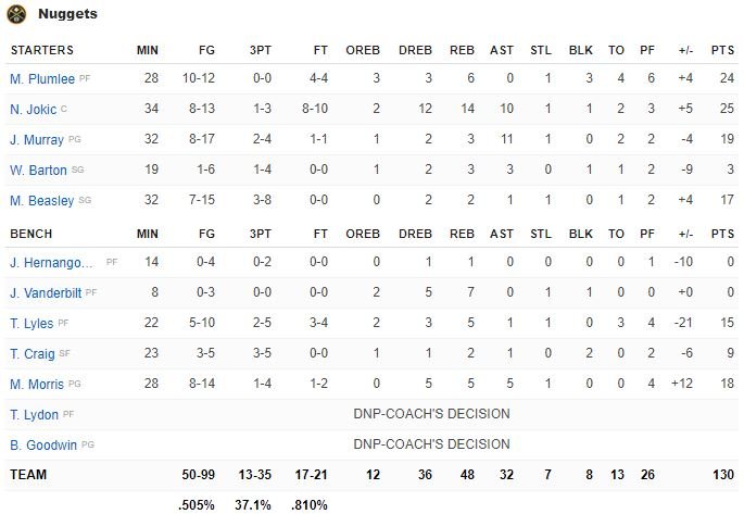 DeMarre Caroll a ajouté 18 points, 10 rebonds et 6 passes, Joe Harris 17 points et Treveon Graham 16 pour des Nets qui restaient sur 3 défaites avant ce match. En face Nikola Jokic a terminé à 25 points, 14 rebonds et 10 passes, son 10ème triple-double de la saison, Mason Plumlee a battu son record en saison avec 24 points à 10/12 contre son ancienne équipe et Jamal Murray, de retour après 6 matchs manqués (cheville), a compilé 19 points et 11 passes, en vain.