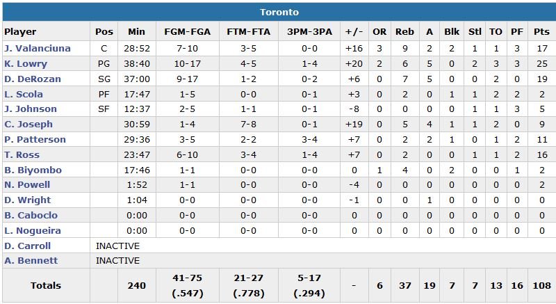 Les 76ers démarrent parfaitement leur match sur un 12-0, profitant du 0/7 de leurs adversaires. Ils restent devant 38-34 après deux 3-points d’Isaiah Canaan à 9 secondes d’intervalle (les deux servis par T.J. McConnell) à 6’48 de la fin du 2e quart. Mais bientôt Toronto passe la seconde avec un 23-6 (démarré par 2 gros dunks de DeRozan) pour repasser devant 57-44 à la pause. Les 76ers vont alors prendre jusqu’à 15 points de retard dans le 3e quart-temps mais reviendront à 75-69 au terme d’un 9-0 dans les dernières 4’17 de la période. Lowry marque alors 6 points d’un 9-4 en faveur de Toronto pour démarrer le 4e. Patrick Patterson met dedans à 3-points pour redonner un peur d’air aux siens à 8’47 du buzzer, 84-73.