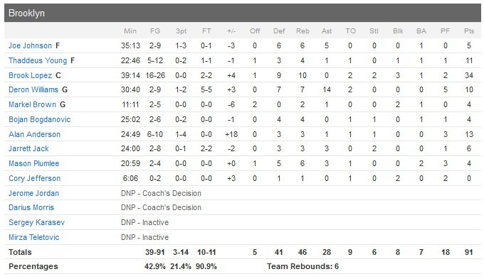 Al Jefferson (11/19, 10 rebonds et 2 contres mais qui selon son coach n’est pas à 100%) et Henderson terminent meilleurs marqueurs des Hornets avec 23 points mais l’équipe perd un deuxième match consécutif  (et une 5e rencontre en 6 matchs en sachant que la suite du calendrier n’est pas clémente) face à un Lopez qui a marqué au moins 26 points lors de ses trois derniers matchs. En face Deron Williams ne passe pas loin d’un triple-double avec 10 points, 14 passes et 7 rebonds alors qu’Alan Anderson ajoute 13 points du banc. Seule mauvaise nouvelle, la blessure de Thaddeus Young (11 points, hyperextension du genou) survenue en fin de troisième quart, pour le moment jugée sans gravité.
