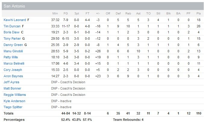Tous les titulaires du Magic marquent au moins 10 points (25 points et 12 rebonds de Nikola Vucevic et 23 points et 10 rebonds de Tobias Harris) mais leur banc est largement dominé par celui des Texans, 41-17. San Antonio revient d’un déficit de 10 points dans le premier quart après avoir souffert en début de match face à la rapidité et l’énergie des visiteurs. En milieu de quart-temps, Orlando et encore devant 20-10 apr_s deux dunks, quelques layups et deux actions à 2+1. Un dunk de Duncan met fin à la série. Les Spurs (pour la première fois au complet cette saison) réussissent à imposer leur rythme dans le deuxième quart et sont devant 51-44 à la pause.