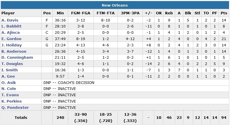 Son compère Nikola Vucevic ajoute 22 points à 10/21 et 13 rebonds. En face Anthony Davis n’a pas été au niveau où on l’attend cette saison (parfois utilisé au poste 5, il n’a pas toujours semblé à l’aise alors qu’Alexis Ajinça n’était pas au meilleur de sa forme avec 4 points et 4 rebonds en 20 minutes) avec 14 points à 3/12, 9 rebonds et tout de même 5 contres. Eric Gordon termine meilleur scoreur pour New Orleans avec 21 points (8/19). L’équipe d’Alvin Gentry a encaissé 100 points ou plus pour la 4e fois en autant de matchs cette saison, tout en ne shootant qu’à 35.6% sur cette rencontre.