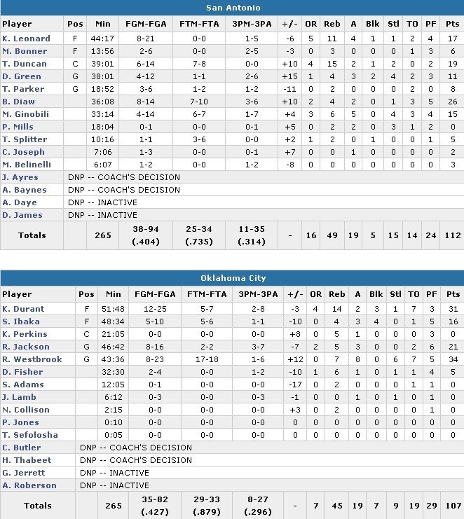 Une prolongation où à San Antonio tous les ballons sont passés par Tim Duncan alors qu’en face le Thunder a connu toutes les peines du monde à marquer, géné par une très bonne défense des Spurs qui a intercepté pas moins de 15 ballons. Encore derrière 105-103 après deux lancers de Westbrook les Spurs se sont appuyés sur Tim Duncan qui a initié un 9-2 avec 7 points de suite pour les mener à la victoire
