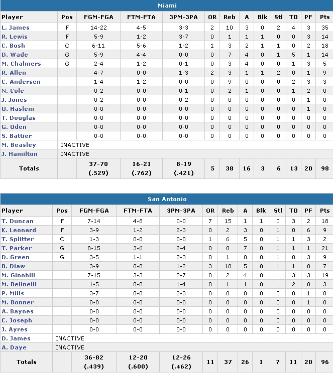 Après un début de match poussif où il n’a inscrit que 2 points à 1/4 aux shoots en premier quart, LeBron James a pris le match à son compte et surtout pris feu en inscrivant 33 points à 13/18 sur le reste de la rencontre. Il a également répondu à chaque tentative de break des Spurs que ce soit en troisième quart ou dans le dernier. Il a été bien épaulé par le trio Chris Bosh (18 points), Dwyane Wade (14 points) et l’excellent Rashard Lewis (14 points à 5/9). Le Heat s’est appuyé sur une belle adresse (52.9%) contre seulement 43.9 aux Spurs.