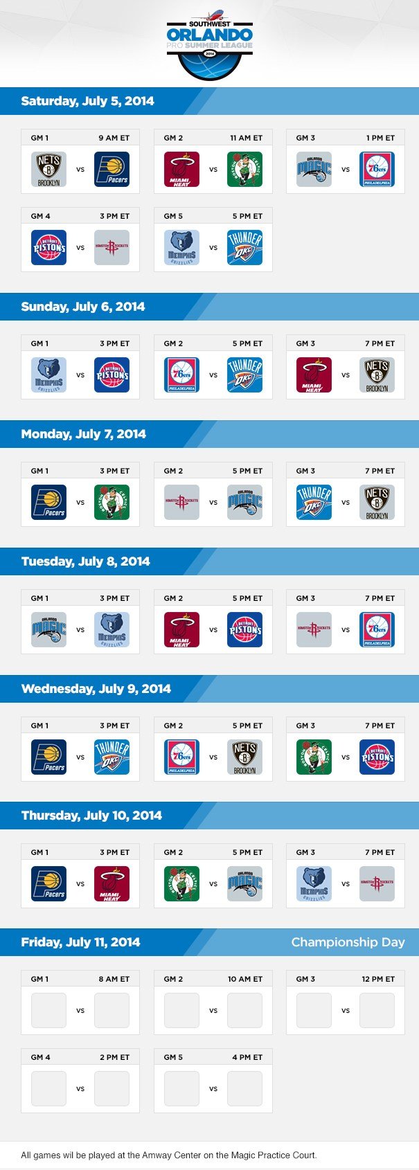Pour ceux qui sont déjà en manque de basket et/ou qui veulent voir à l’oeuvre les derniers rookies, demain débute la Summer League d’Orlando avec la participation de 10 équipes: Orlando Magic, Boston Celtics, Brooklyn Nets, Detroit Pistons, Houston Rockets, Indiana Pacers, Memphis Grizzlies, Miami Heat, Oklahoma City Thunder et Philadelphia 76ers. 25 matchs seront joués entre le 5 et le 11 juillet.