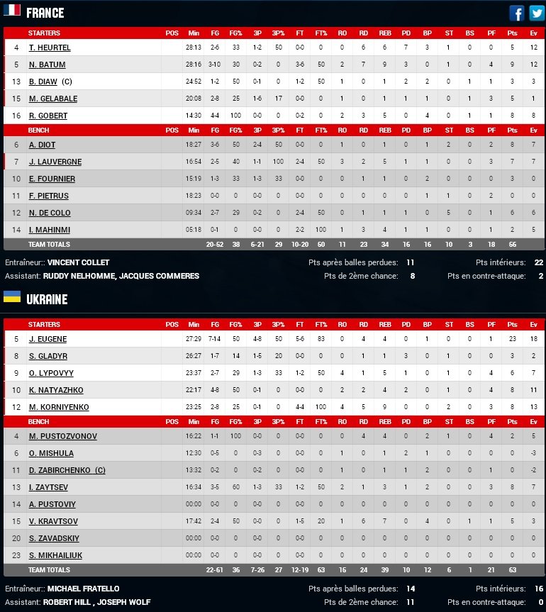 Aucun bleu n’atteint les 10 points. Nicolas Batum inscrit 9 points à 3/10 avec 9 rebonds, Gobert et Diot en ajoutent 8 et Lauvergne 7.