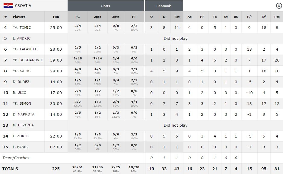 La Croatie peut remercier Bogdanovic, auteur de 26 points à 9/18. Ante Tomic et Simon l’ont bien aidé dans les moments importants avec respectivement 8 et 12 points tandis que Dario Saric après un début tonitruant a connu une suite de match plus compliqué, notamment dominé par Andray Blatche. Blatche a lui connu un match à deux visages avec un première mi-temps catastrophique (3/13 aux tirs) et une seconde impressionnante (7/11 aux tirs). Il a été bien aidé par les 17 points de Jeff Chan.