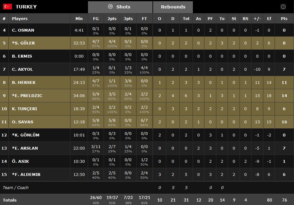 Le retour sur le parquet d’Oguz Savas (16 points à 5/8 et 2 rebonds) apporte un nouveau souffle à la Turquie, qui parvient à revenir à égalité 72 partout à 3 minutes du coup de sifflet final. Predlzic enchaîne sur un 3-points qui redonne l’avantage aux Turcs, qui n’avaient plus menés depuis un quart-temps, 75-72. Après un lancer-franc (76-72) signé Savas, la Nouvelle Zélande enchaînent trois échecs à trois-points et file droit vers la défaite malgré une dernièce chance de loin à la dernière seconde pour égaliser qui rebondit sur l’arceau.