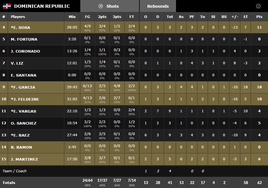 La première mi-temps a été marqué par une bonne défense des deux côtés et pas mal de maladresse. L’Ukraine a fait la différence dans les cinq premières minutes de la seconde mi-temps grâce à une grosse adresse extérieure. Alors que le score était de 27-27 ils ont passé un 14-0 en 3 minutes et 30 secondes grâce à 4 tirs à trois points de suite signés Sergii Gladyr (x2), Pooh Jeter et Maxym Korniyenko. Eulis Baez et Francisco Garcia ont enté de ramener les Domincains mais le quatuor Jeter, Gladyr , Kroniyenko et Slava Kravtsov a répondu a chaque tentative de retour. L’Ukraine a tenu ses 8 points d’avance en dernier quart puisque jamais les coéquipiers de Francisco Garcia n’ont pu revenir à moins de 7 points.