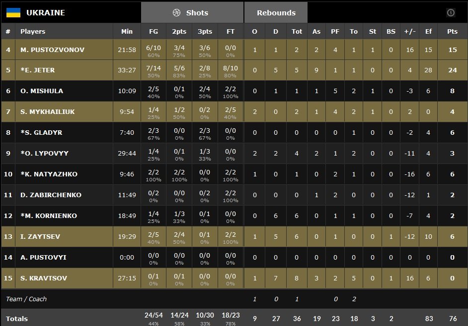 Huff remet les choses au clair après la courte pause (22-23) et on assiste à un festival de shoots manqués côté ukrainien malgré une ribambelle de rebonds offensifs. Les défenses se resserrent et de longues minutes passent avant que Petteri Koponen (14 points à 4/12 et 9 passes) puis Huff ne trouvent la mire (22-28 à 5’53), forçant l’Ukraine à prendre un temps-mort. Réorganisée, l’équipe en bleu et jaune repasse devant sur un tir primé de Maksym Pustozvonov (15 points à 6/10) et Jeter se montre plus entreprenant avec 4 points dont 2 lancers-francs en 30 secondes qui permettent à son équipe de se maintenir en tête 35-30. Un répit de courte durée puisqu’à la mi-temps, Koponen et ses troupes sont revenus à deux petits points, 37-35, dans un match encore bien indécis.