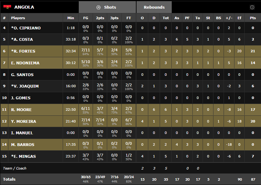 Face aux physiques angolais, très présents sous les panneaux avec le duo Reggie Moore (17 points et 6 rebonds) – Yanick Moreira (20 points et 5 rebonds) et avec des extérieurs adroits et agressifs en la personne de Roberto Fortes (21 points à 7/11) et Edson Ndoniema (14 points) les Slovènes ont eu de grosses difficultés à les contenir et les deux équipes se sont suivies comme leur ombre pendant 35 minutes. A l’entame du dernier acte le score était de 66-65 pour l’Angola mais les Slovènes ont haussé le ton défensivement, s’offrant des opportunités sur le jeu rapide et ils ont poursuivi avec une grosse adresse extérieure (14/33 sur le match). Klobucar, Prepelic et Muric ont permis aux Slovènes de passer un 10-0 pour filer vers la victoire même si Ndoniema a entretenu l’espoir pour l’Angola dans la dernière minute, en vain.