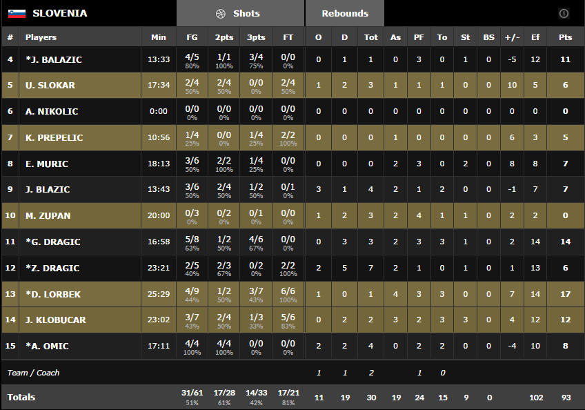 La Slovénie continue son parcours parfait grâce à ses 14 tirs à trois points et à un collectif très équilibré avec 7 joueurs entre 7 et 17 points dont 17 pour Domen Lorbek et pour Jaka Klobucar.