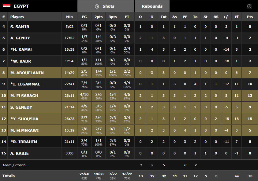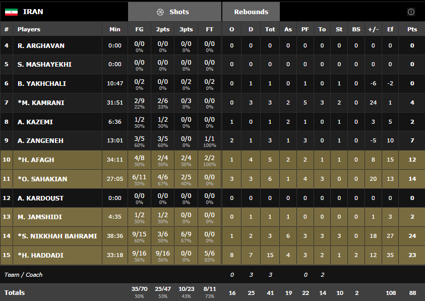 Comme on pouvait s’y attendre les champions d’Asie ont dominé sans trop de soucis les derniers finalistes de l’Afrobasket avec un Hamed Haddadi dominant face à la petite raquette égyptienne. Il compile 23 points, 15 rebonds et 4 passes. Samad Nikkhah Bahrami, l’autre scoreur de l’équipe n’a pas été en reste avec 24 points à 6/9 à trois points et 6 passes. Dominants à l’intérieur (16 rebonds offensifs et 48 points dans la peinture), les Iraniens ont aussi été adroits de loin avec un joli 10/23 aux tirs.