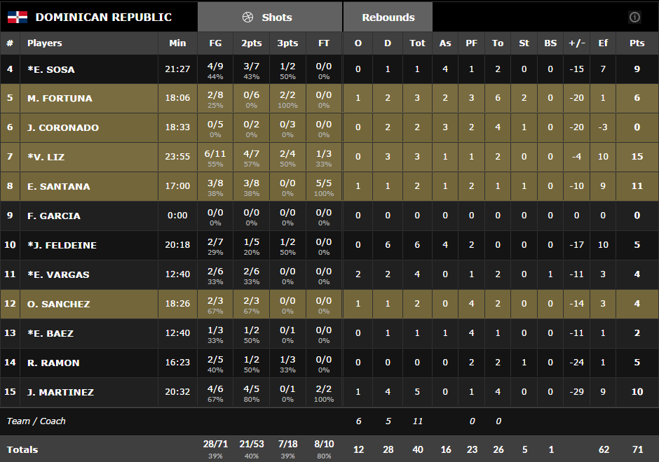 Comme à quasiment tous leurs matchs depuis ce début de compétition Team USA a débuté doucement face à une équipe de République Dominicaine qui a bien tenu en premier quart malgré l’absence de Francisco Garcia, mis au repos. Ils ont réussi à trouver des solutions dans la défense américaine par l’intermédiaire de Jack Martinez et Edgas Sosa et profité de la maladresse US (9/23). Ce n’est qu’à la faveur de leurs 6 rebonds offensifs que Team USA a conclu le premier quart devant 25-22 après avoir mené 13-5.
