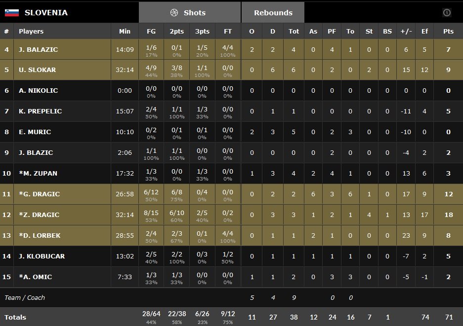 À la reprise, Martinez encore lui réduit l’écart à deux points, 52-54. Le compteur reste bloqué pour la Slovénie, qui reprend une grande respiration sur un shoot à 3-points désespéré de Klemen Prepelic. Bouffée d’air de courte durée puisque Ronald Ramon lui rend sur l’action suivante. G. Dragic enfile sa tenue de leader pour redonner 4 points d’avance aux siens au niveau de la ligne des lancers. Lorbek et son frère l’imite et les Slovènes reprennent 8 longueurs 63-55 à 4 minutes de la fin du match. La fin de match est marquée par un superbe contre de Zoran Dragic, qui donnera 10 points d’avance à son équipe à 1’39 du buzzer. La Slovénie se qualifie donc pour les quarts de finale grâce à une victoire pas si facile qu’elle n’y paraît, 71-61.