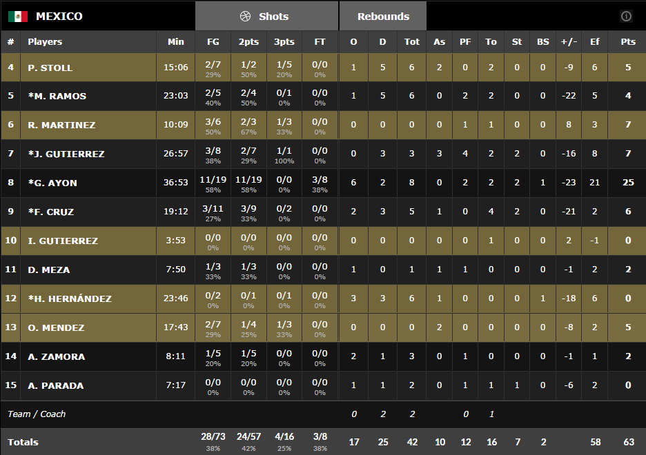 En second quart Gustavo Ayon a inscrit les 6 premiers points des siens, mais de l’autre côté Team USA trouvait trop facilement la solution dans la défense mexicaine, 30-19. Maladroits à l’extérieur, le Mexique a vu son compteur resté bloqué à 19 pendant plusieurs minutes, sans que les Américains en profitent vraiment, 35-19. Assez maladroits (42% à la pause) ces derniers ont vu le Mexique s’accrocher un peu et rester à moins 15 à la mi-temps. En cette première mi-temps Team USA a comme souvent profité de sa force en transition et en contre-attaque et quelques paniers extérieurs par James Harden et Curry pour mener assez facilement alors que côté Mexique, seuls quatre joueurs ont marqué, dont 12 unités pour Ayon.