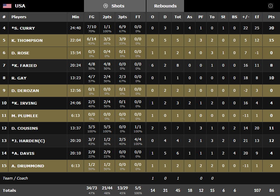 Victoire logique et aisée pour les Etats-Unis face au Mexique 86-63. Malgré un excellent Gustavo Ayon, auteur de 25 points et 8 rebonds, le Mexique n’a jamais été en mesure d’inquiéter les US, même quelques minutes. Stephen Curry termine meilleur marqueur avec 6 tirs à trois points inscrits pour 20 points à 7/10. Son coéquipier Klay Thomson ajoute lui 15 points, James Harden 12 et DeMarcus Cousins 11. Les Mexicains ont été limités à 38% aux tirs alors que Team USA a shooté à 13/29 derrière la ligne à trois points.