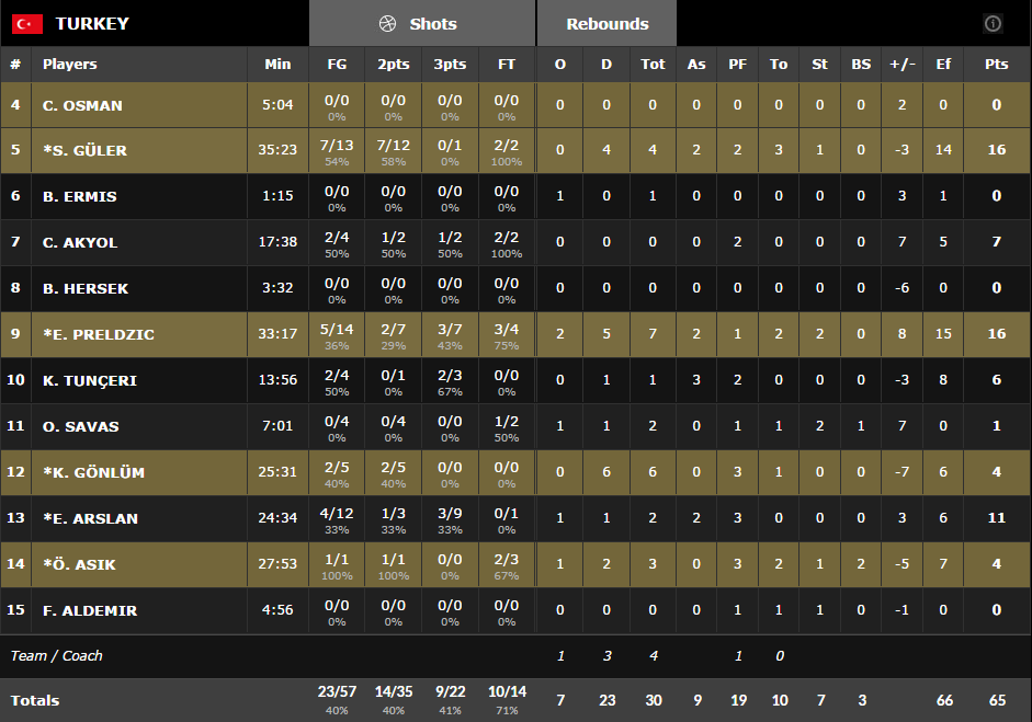 Quel retour encore de la Turquie qui arrache sa qualification pour les quarts de finale au dépens de l’Australie grâce à Emir Preldzic (il a inscrit ses 16 points en seconde mi-temps), auteur de deux tirs à trois points dans les 50 dernières secondes dont un à 5 secondes du buzzer pour donner la victoire aux siens 65-64. La Turquie avait pourtant fait la course derrière quasiment tout le match mais c’est elle qui jouera la Lituanie en quart de finale.