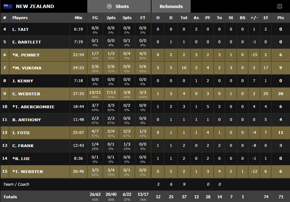 les shooteurs Kirk Penney et Thomas Abercrombie ont remis la Nouvelle-Zélande à distance respectable en début de troisième quart, 40-34 et les débats se sont équilibrés. Bien plus adroite qu’en première mi-temps, malgré ses soucis à l’intérieur, la Nouvelle-Zélande s’est ainsi accrochée et après un 6-0 lituanien (54-40) grâce à D.Lavrinovic et Seibutis elle a répliqué par l’intermédiaire d’Isaac Fotu, Casey Frank et surtout Corey Webster pour garder espoir à l’entame du dernier acte, 48-40.